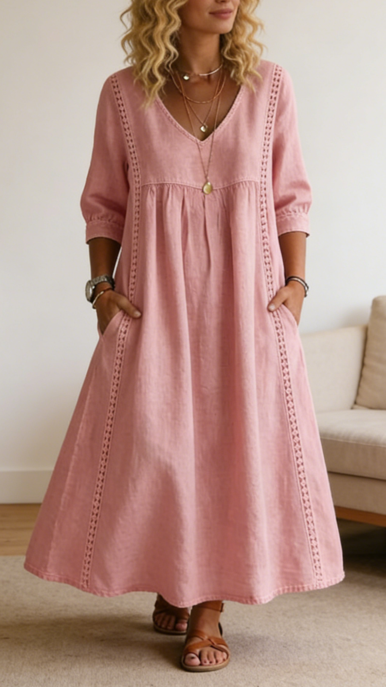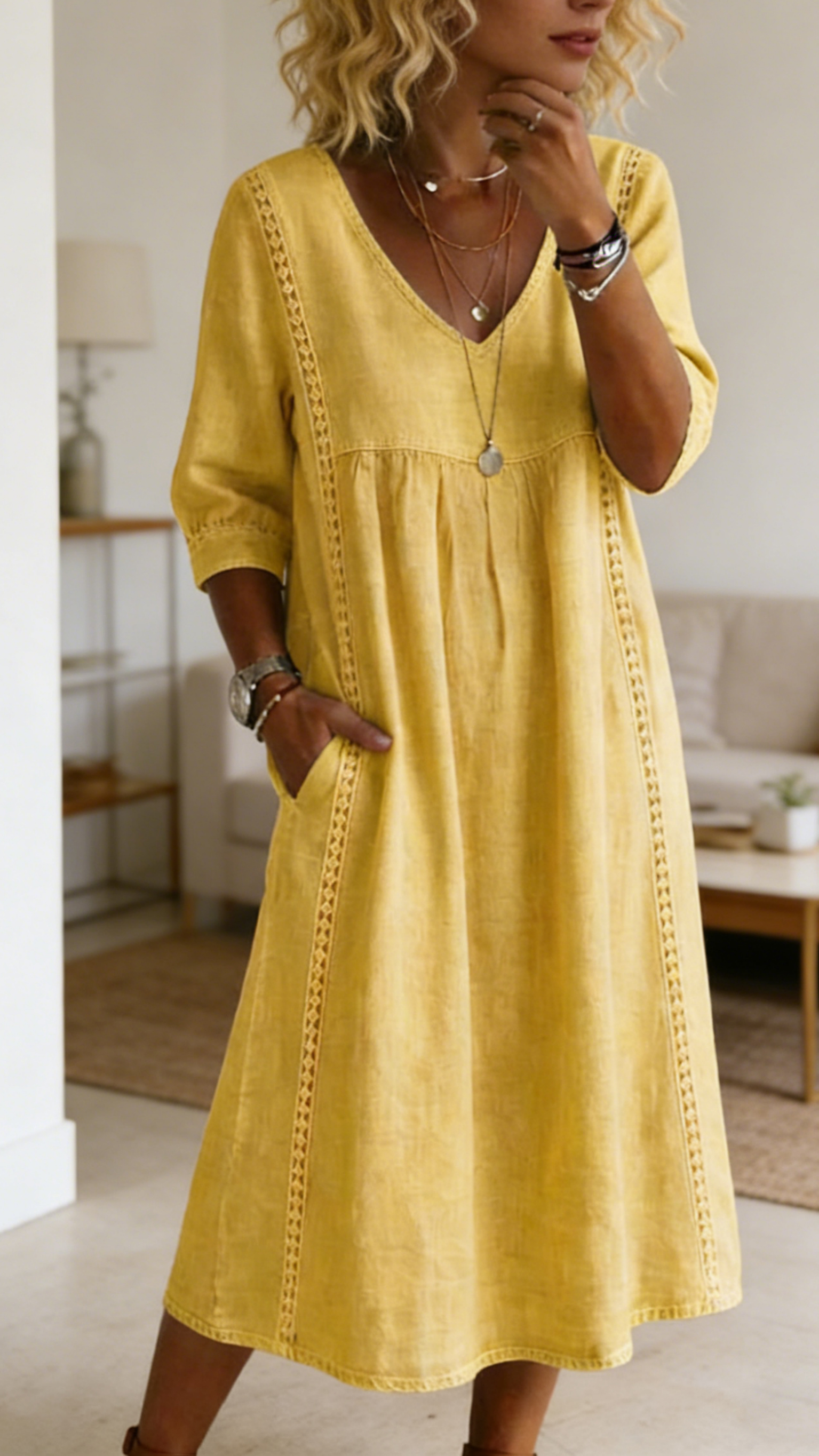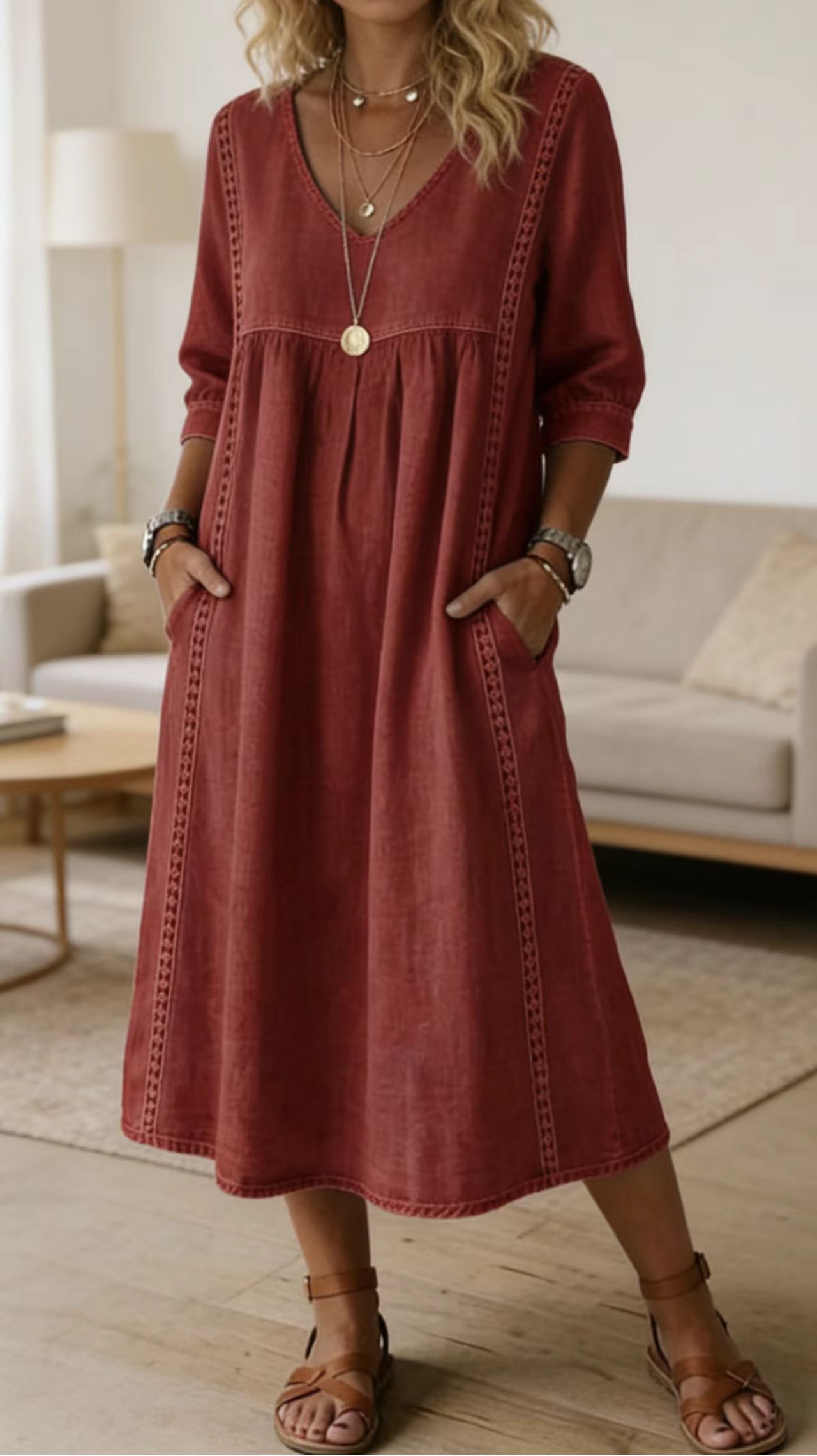 This dress features a smooth V-neck, 3/4 sleeve design, decorated with delicate lace hollow-out panels on the skirt, all crafted from premium polyester (faux denim) fabric. It not only has the retro texture and excellent wrinkle resistance of denim, but also combines the drape, structure and easy-care properties of polyester. The loose A-line silhouette perfectly fits all body types and easily modifies the figure. Whether you are commuting daily, going on vacation, meeting friends or relaxing at home, this dress can create a lazy and casual high-end feeling with minimal matching. As you move, the hem sways naturally, exuding a relaxed and retro casual vibe, which is your best choice to create a summer retro look.