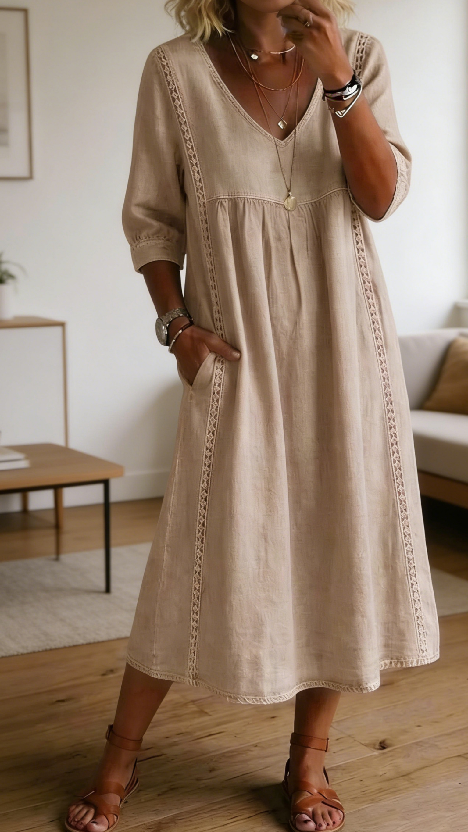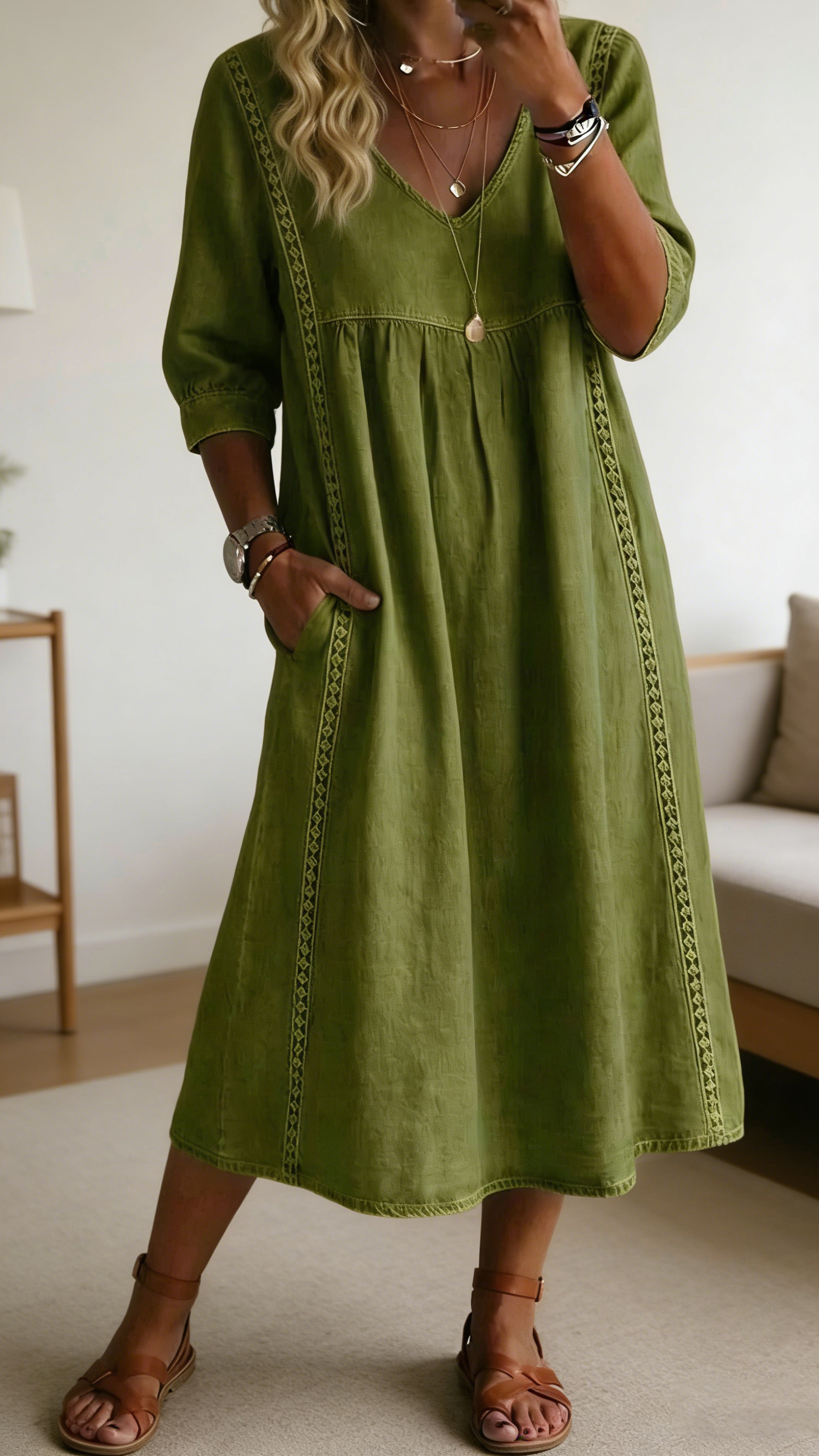 🌿Casual Style - V-Neck Faux Denim Lace Panel Midi Dress